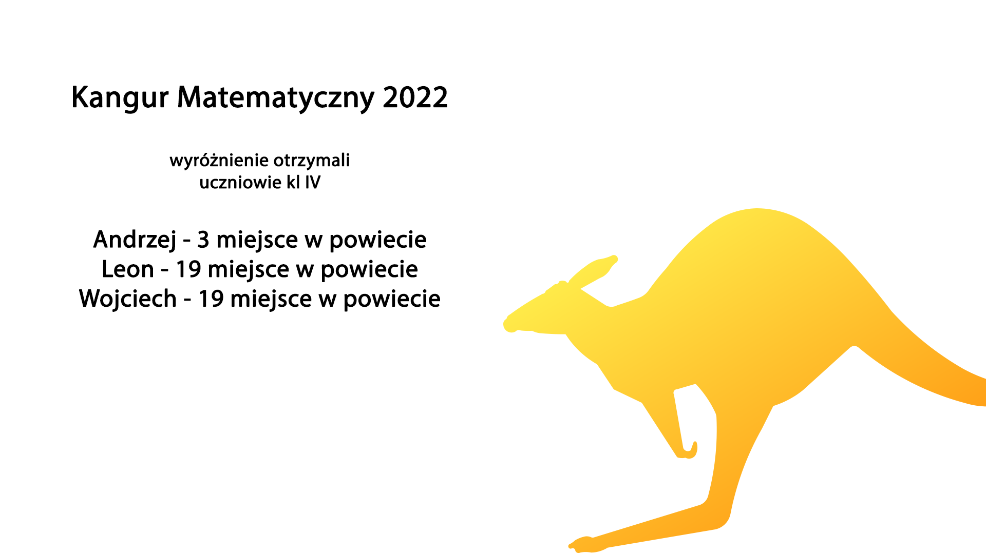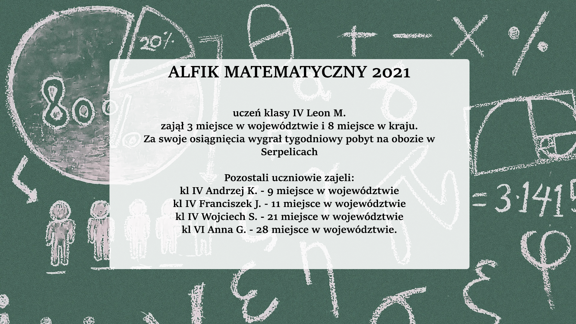 Leon M., uczeń klasy V, otrzymał wynik bardzo dobry – zdobył 5 miejsce w powiecie i 11 miejsce w regionie i otrzymał nagrodę pieniężną.